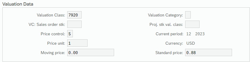 The Valuation Data section contains Price Control, which determines if a material is valuated at Standard (S) or Moving Average (V) price. You can change the price control from S to V at any time. The target field, in this case, the Moving average price, is overwritten with the Standard price to ensure no change in inventory valuation for existing stock.
