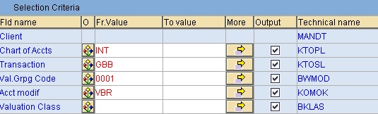 You restrict the table entries displayed on the subsequent results screen by making entries in the Selection Criteria section. To display GL accounts posted during goods issues GI to production orders, make the following entries: