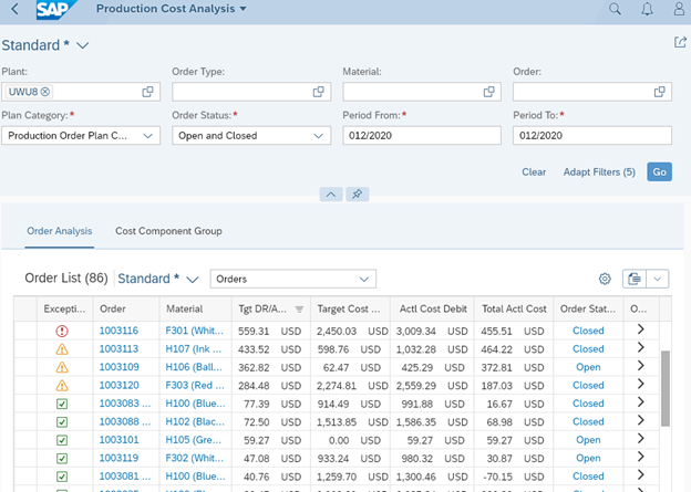 The Production Cost Analysis app in Figure 1, replaces SAP GUI order selection report S_ALR_87013127.